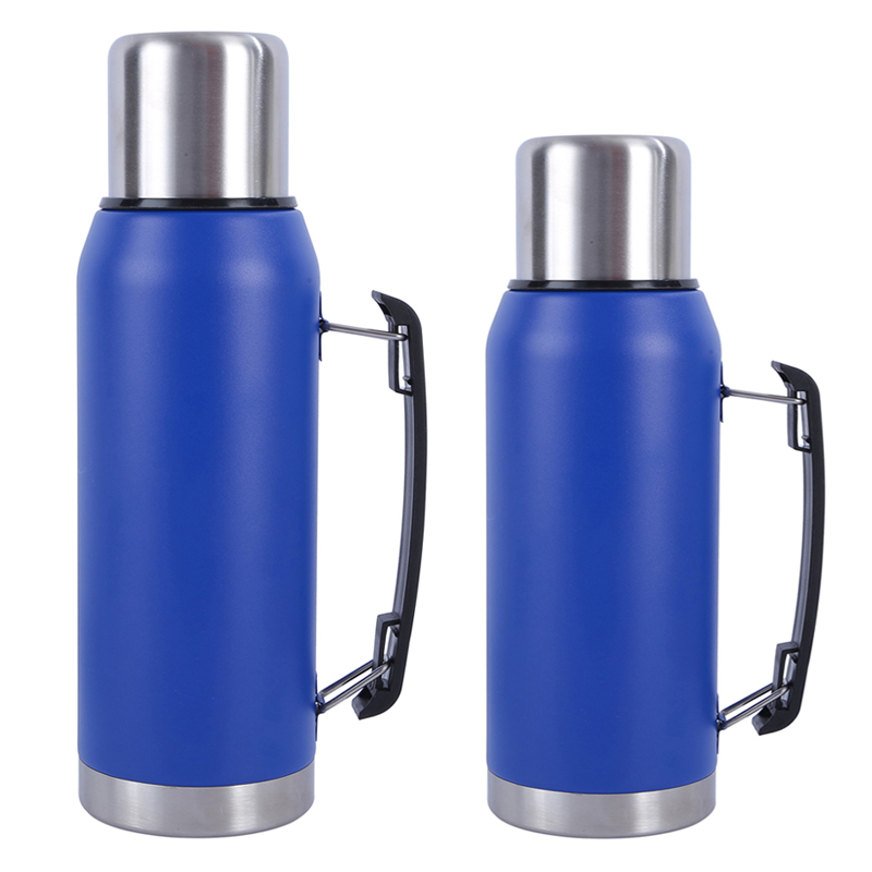 Hier is twee groottes van blou vakuumflesse vir u. Die een aan die linkerkant het 'n hoogte van 32,5 cm en 'n deursnee (gemeet aan die onderkant) van 11,2 cm. Die een aan die regterkant het 'n hoogte van 29,2 cm en dieselfde onderdiameter van 11,2 cm. Albei het 'n vlekvrye - staal bo en onder, saam met 'n draagbare handvatsel, wat gerieflik is om tydens buitelugaktiwiteite of daaglikse gebruik te dra.