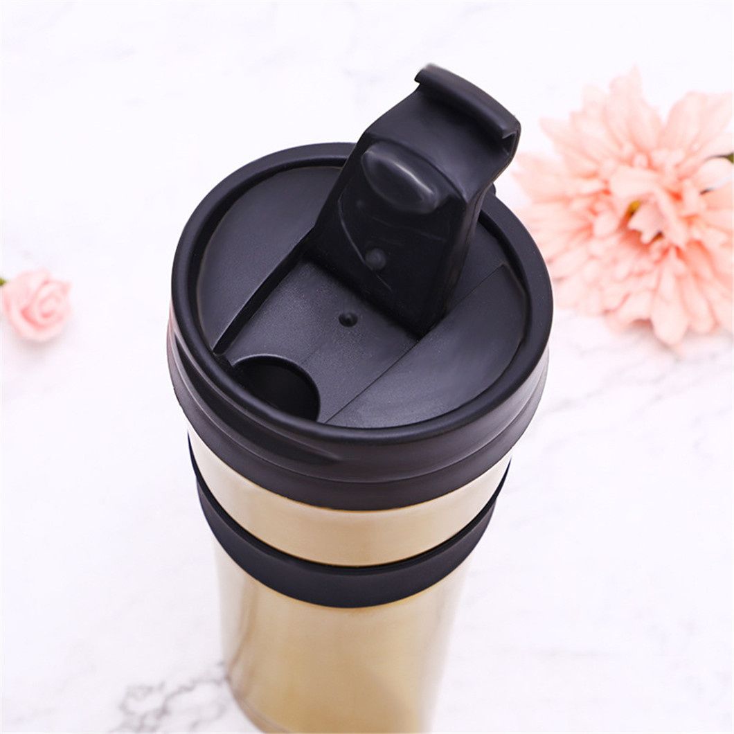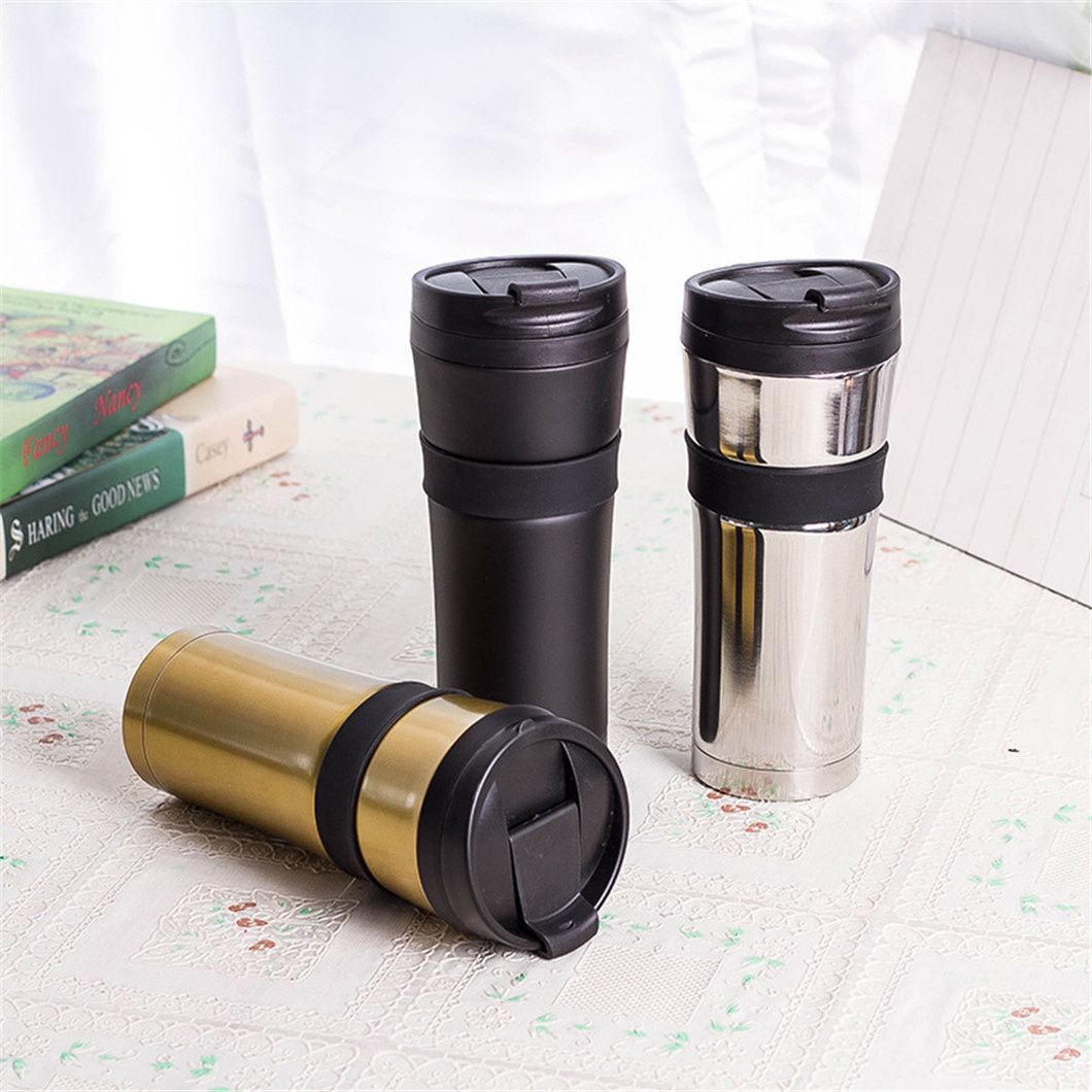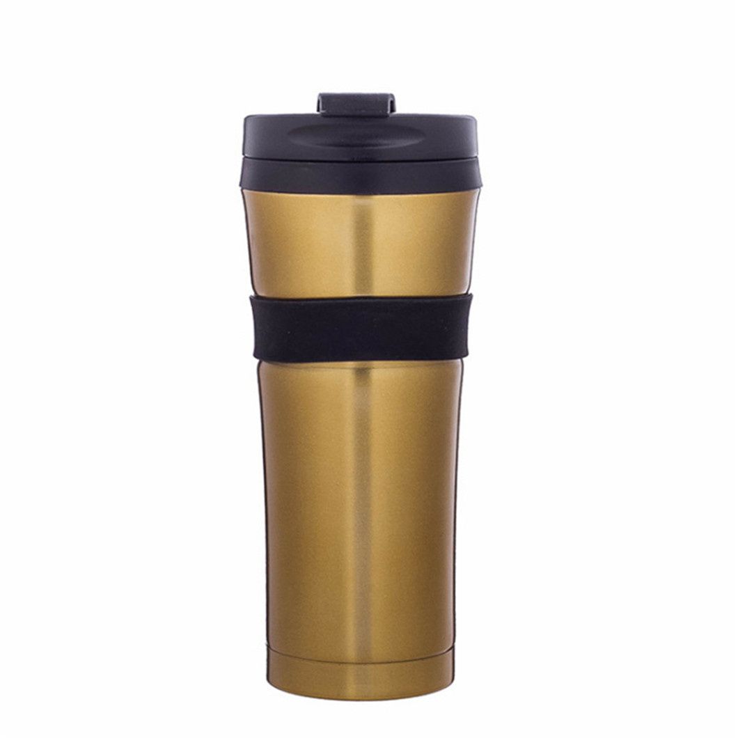 Hierdie vlekvrye staal -termos kom in goud-, swart- en silwerafwerkings, met beskikbare aanpassingsopsies. Met 'n gladde swart deksel en 'n duursame swart rubberring in die middel wat voorkom dat dit gly en die beker beskerm, is dit ideaal om u daaglikse drankies soos koffie of warm water te dra.