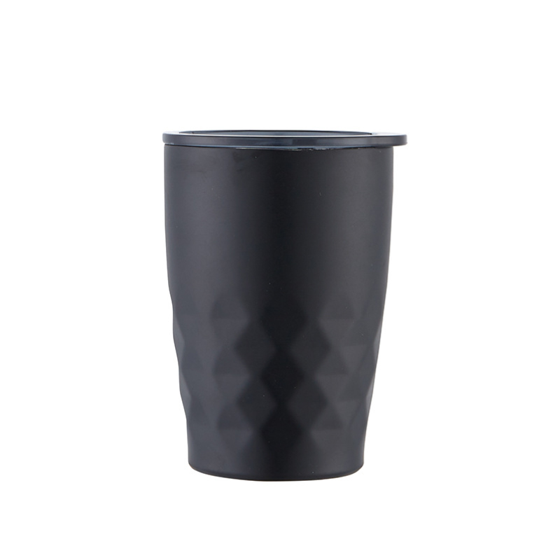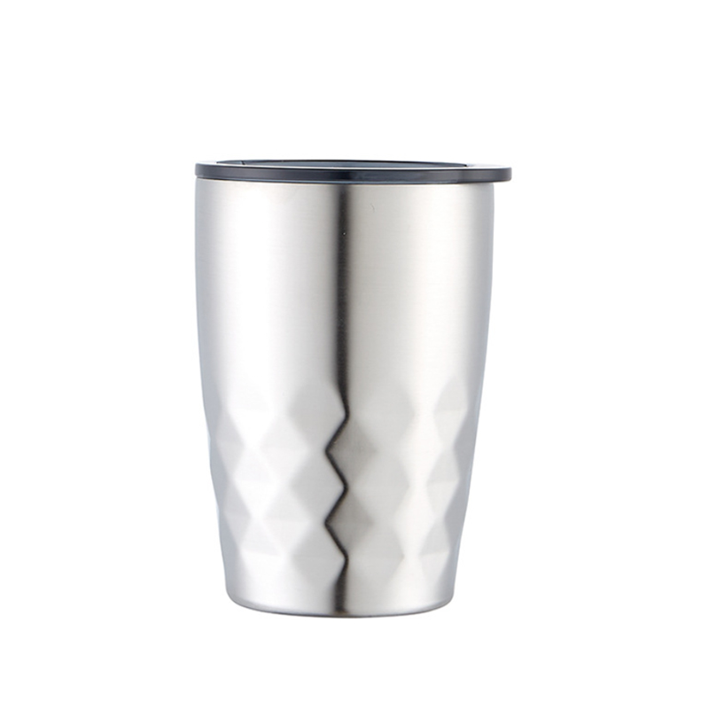 Hierdie vlekvrye staalbeker het 'n vakuumontwerp, wat dit ideaal maak vir draagbare gebruik in motoromgewings. Dit handhaaf temperatuur effektief, hetsy vir warm of koue drankies, en kan ook as 'n koffiebeker dien. Die beker se lyf bevat diamantvormige ontwerpelemente, wat praktiesheid met estetiese aantrekkingskrag kombineer. Ideaal vir verskeie geleenthede, dit voldoen aan die vraag na gerieflike dranktemperatuurbewaring en maklike gebruik.