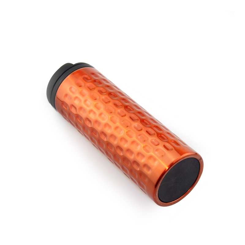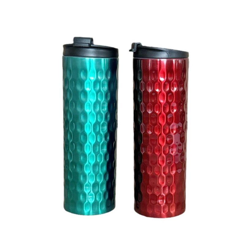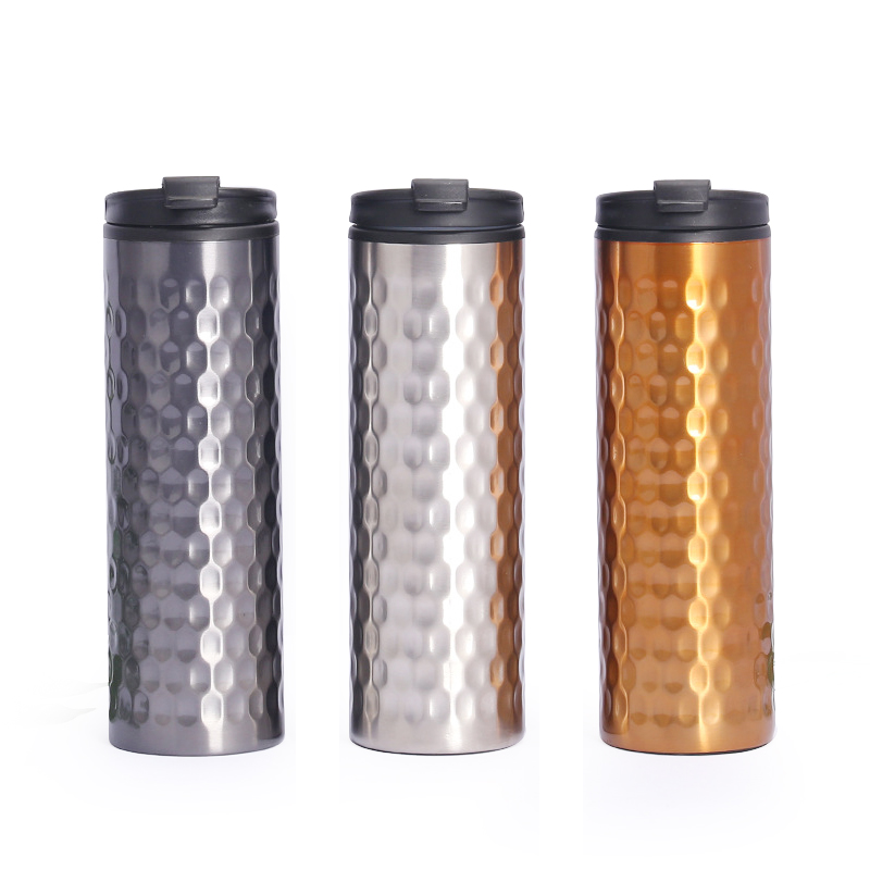 Hierdie termiese beker spog met 'n kenmerkende ontwerp met veelvuldige metaalkleuropsies, waaronder silwergrys, silwer en goudbruin, wat ryk tasbare teksture vertoon. Die liggaam het 'n reliëfpatroon wat lyk soos heuningkoek of hamerpatrone, wat nie net visuele diepte en artistieke flair toevoeg nie, maar ook die wrywing van die greep verhoog vir makliker hantering. Saam met 'n minimalistiese swart deksel, bereik die ontwerp 'n gesofistikeerde dog onderskatte estetika wat beide prakties is vir daaglikse gebruik en stylvol genoeg is om uit te staan as 'n elegante reisgenoot.