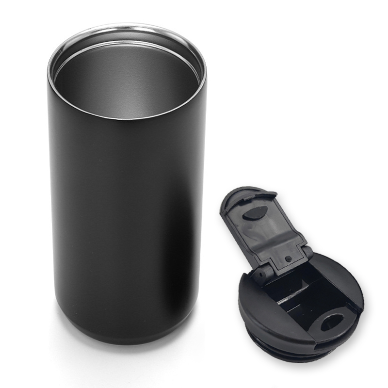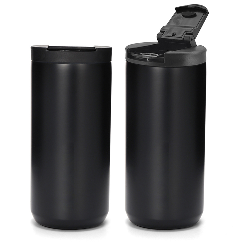 Hierdie 330 ml dubbellaag vakuum-geïsoleerde koppie gemaak van 304 vlekvrye staal het 'n slanke swart ontwerp met 'n reguit-drankstyl en 'n flip-top deksel. Ideaal vir koffie, tee en ander drankies, sy dubbellaag vakuum-isolasie handhaaf dranktemperatuur effektief. Die kompakte grootte maak dit ideaal vir daaglikse gebruik—hetsy pendel, oefen of ry.