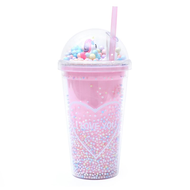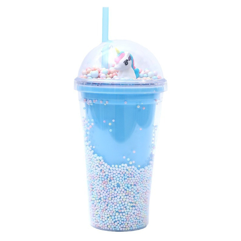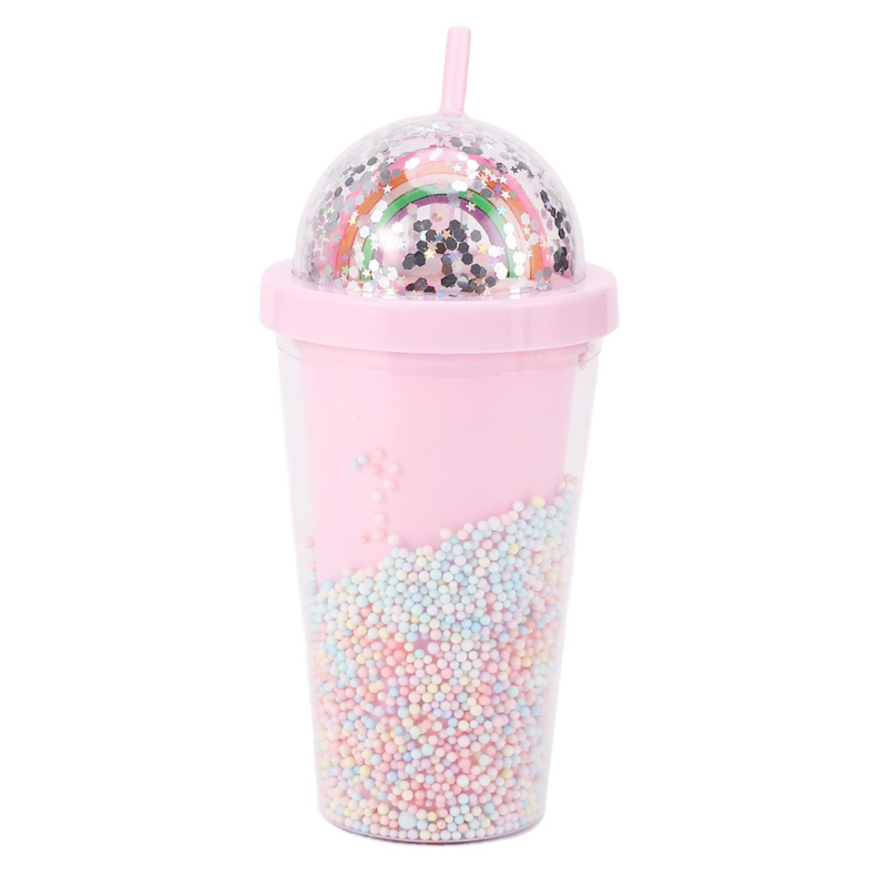 Die koepelvormige deksel steel die vertoning: kies tussen 'n glinsterende reënboog (gewerl met sterglitter) of 'n piepklein 3D-eenhoring (gesetel in pastel kraletjies)—dit is soos om 'n mini-sprokie te dra oral waar jy gaan. Die beker se dubbelwand is gevul met drywende pastelkrale en glinster, so dit blink met elke beweging (geen gemors, net magic!).