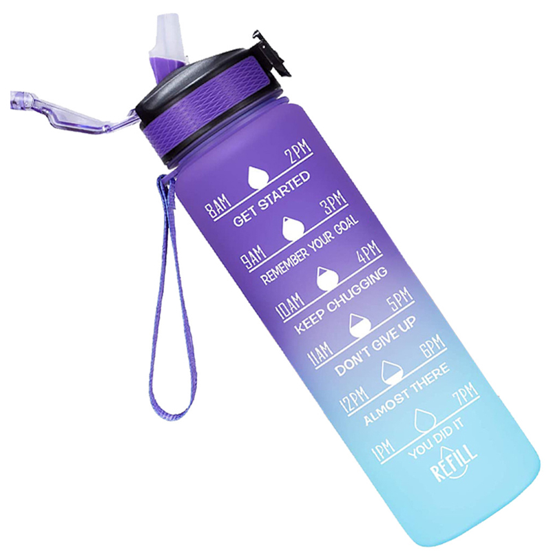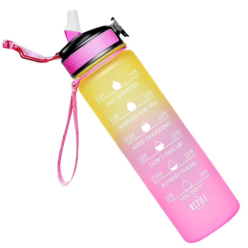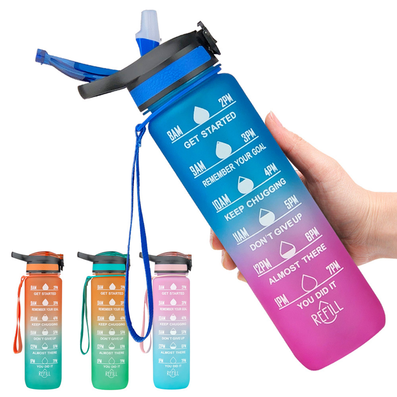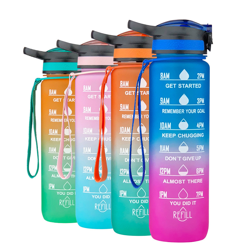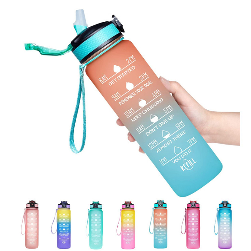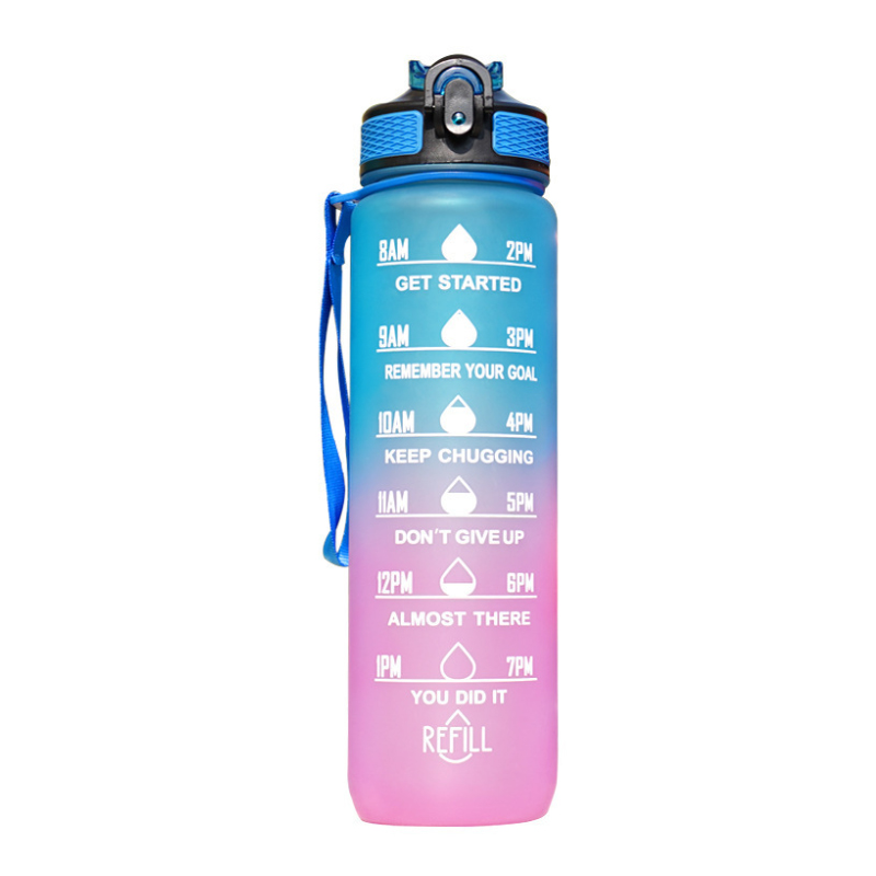 Hierdie 1000 ml sportwaterbottel kombineer die funksies van 'n plastiekruimtebeker en 'n buitelugreisbruik met 'n gradiëntkleurontwerp. Die stylvolle gradiëntvoorkoms maak dit ideaal om tydens buitelugaktiwiteite te dra, om aan die daaglikse hidrasiebehoeftes en die eise van liggaamlike oefening te voldoen.