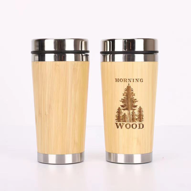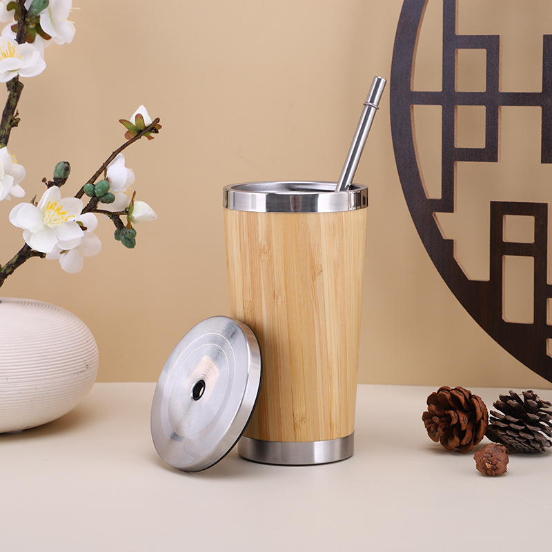 'n Kreatiewe dubbellaag vlekvrye staal geïsoleerde koppie gemaak van bamboes, wat die verfynde elegansie van besigheid en daaglikse lewe beliggaam.