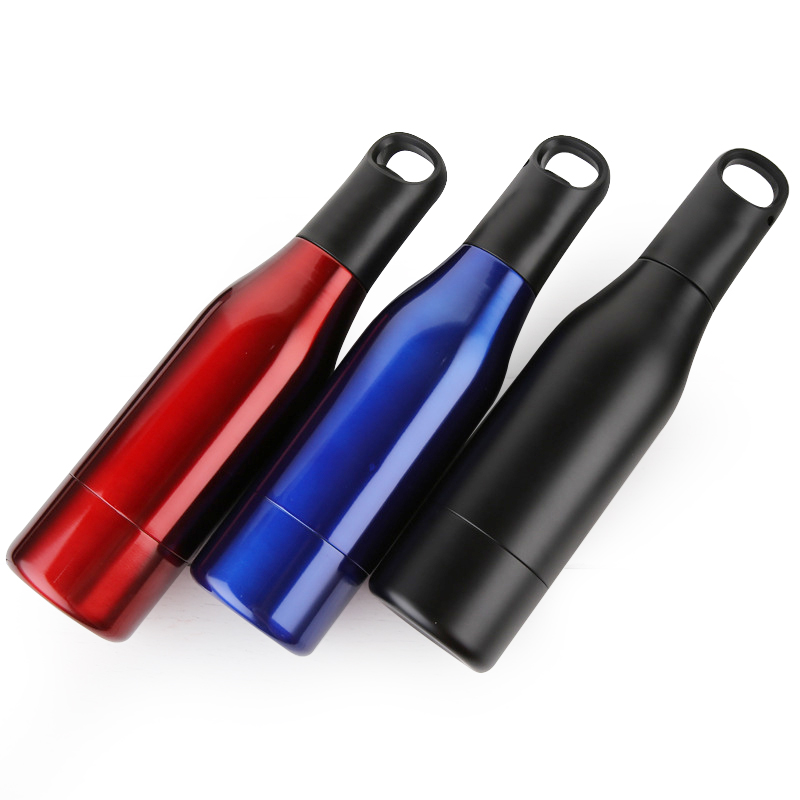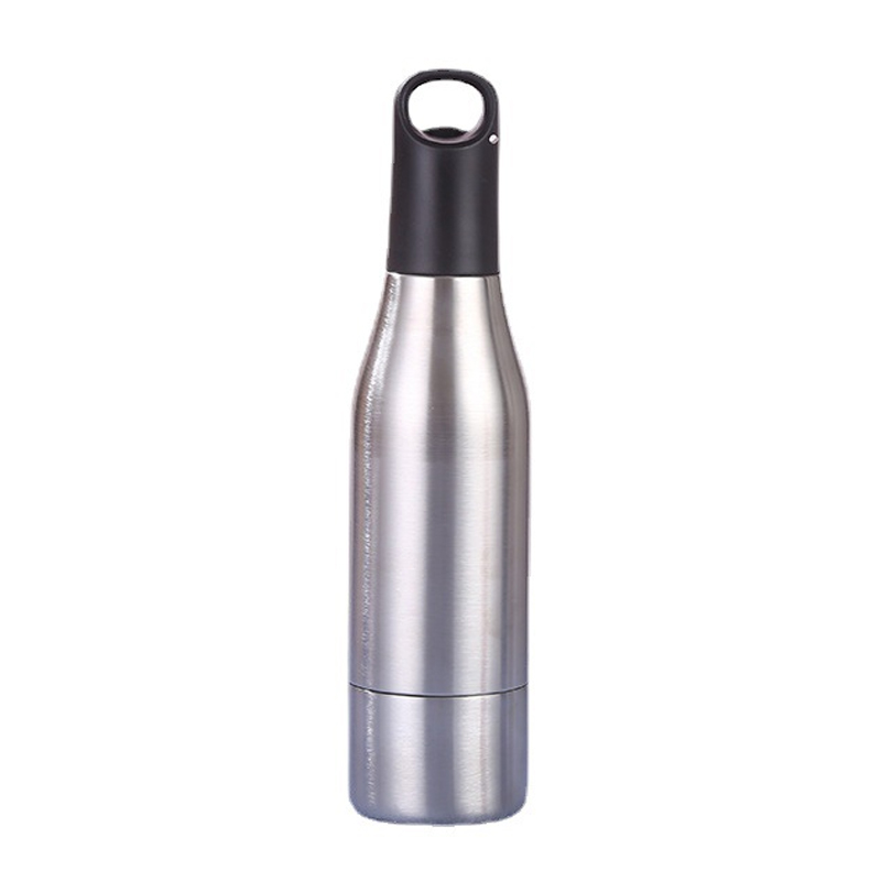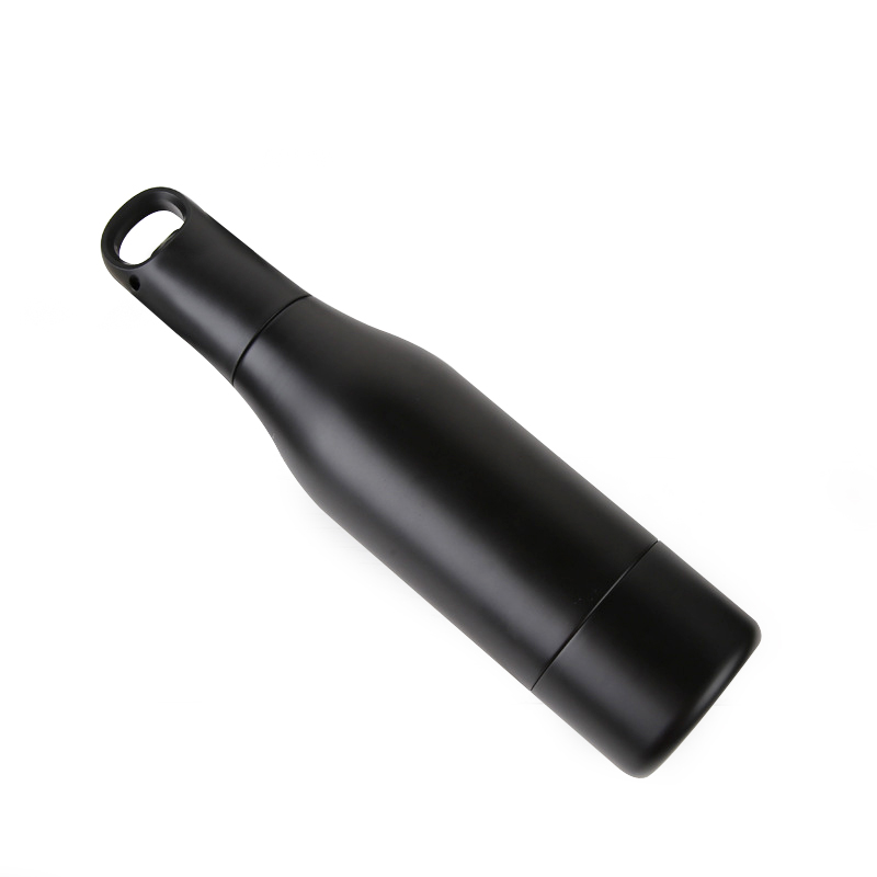 Met 'n kapasiteit van 500 ml en 'n bottelagtige vorm, het die bokant 'n swart deksel met 'n ringhandvatsel. Die algemene ontwerp is eenvoudig en maklik om te dra. Hierdie soort houer kan gebruik word vir gebottelde drankies en het die funksie om koud te hou. Dit is geskik vir ontspanningsgebruik en kan gemak bied vir drinkervaring.